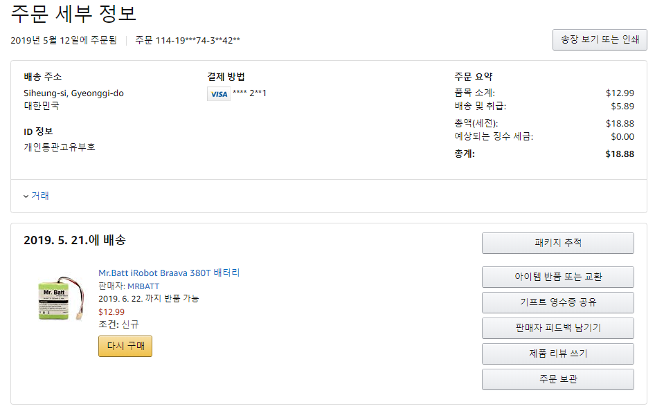 5월 12일에 아마존에서 주문을 하였고 5월 21일에 배송 완료되었습니다.