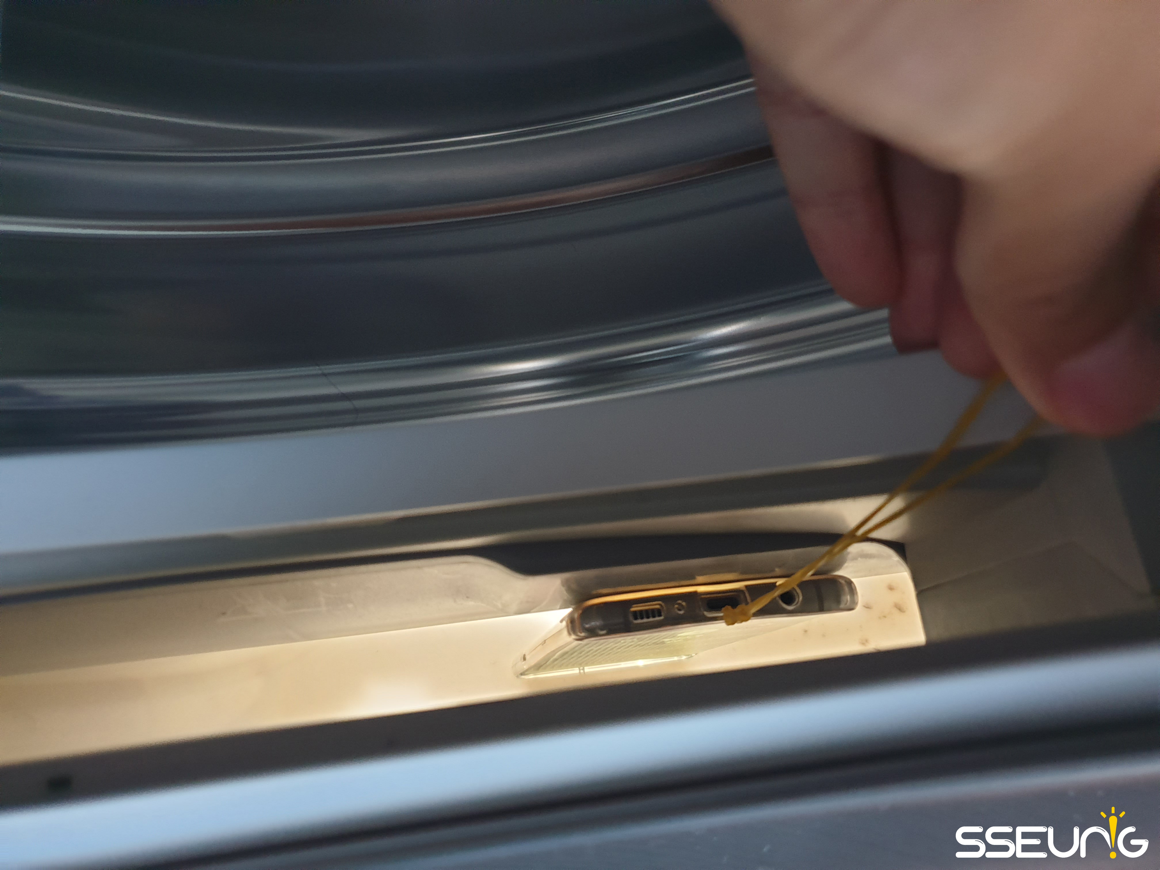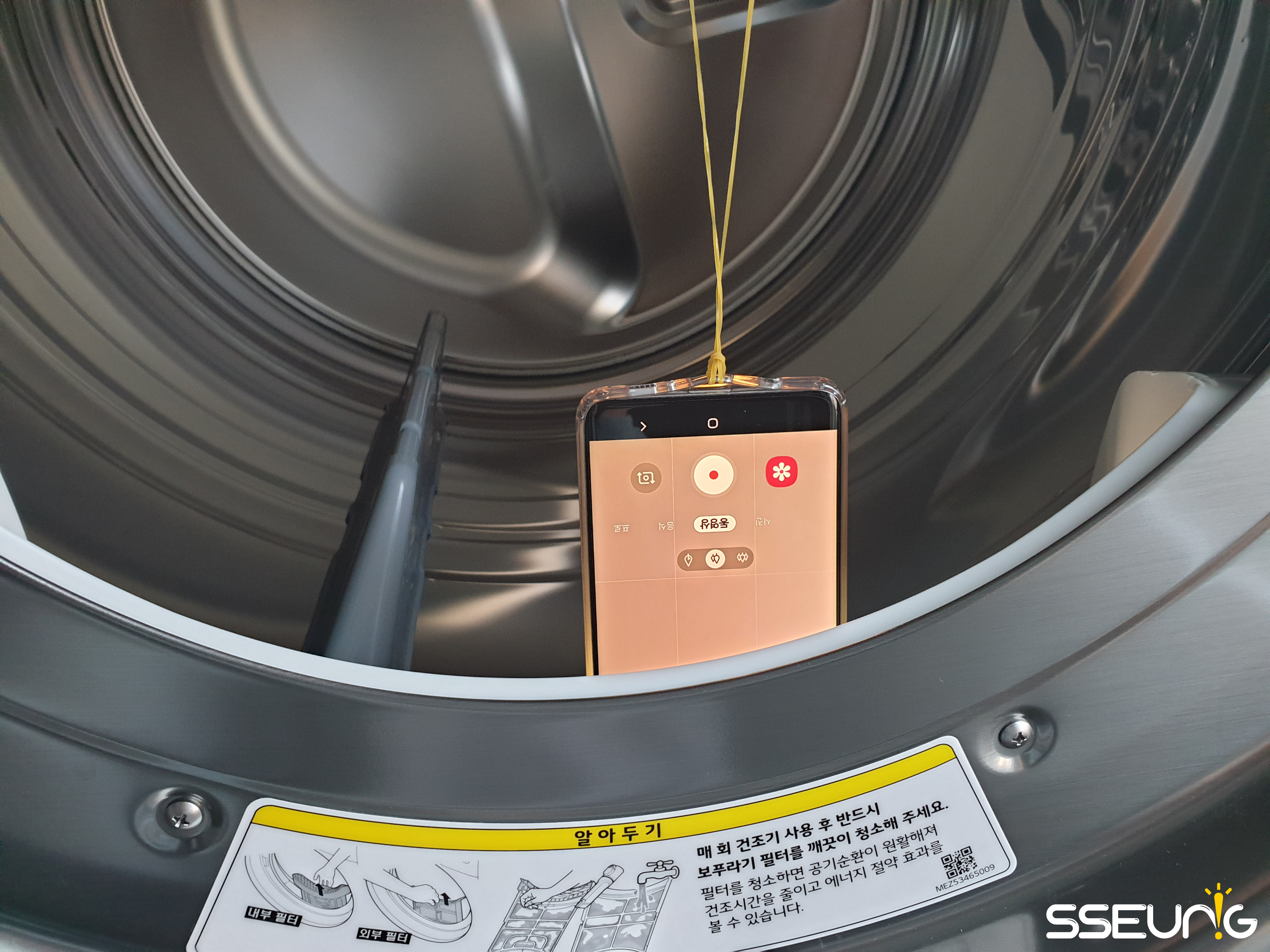 카메라 어플을 구동시킨 뒤, 플래시 및 동영상 촬영을 설정하고 건조기에 조심스럽게 집어넣습니다. 고무줄이 끊어질 수 있으므로 조심히 넣으시면 됩니다.