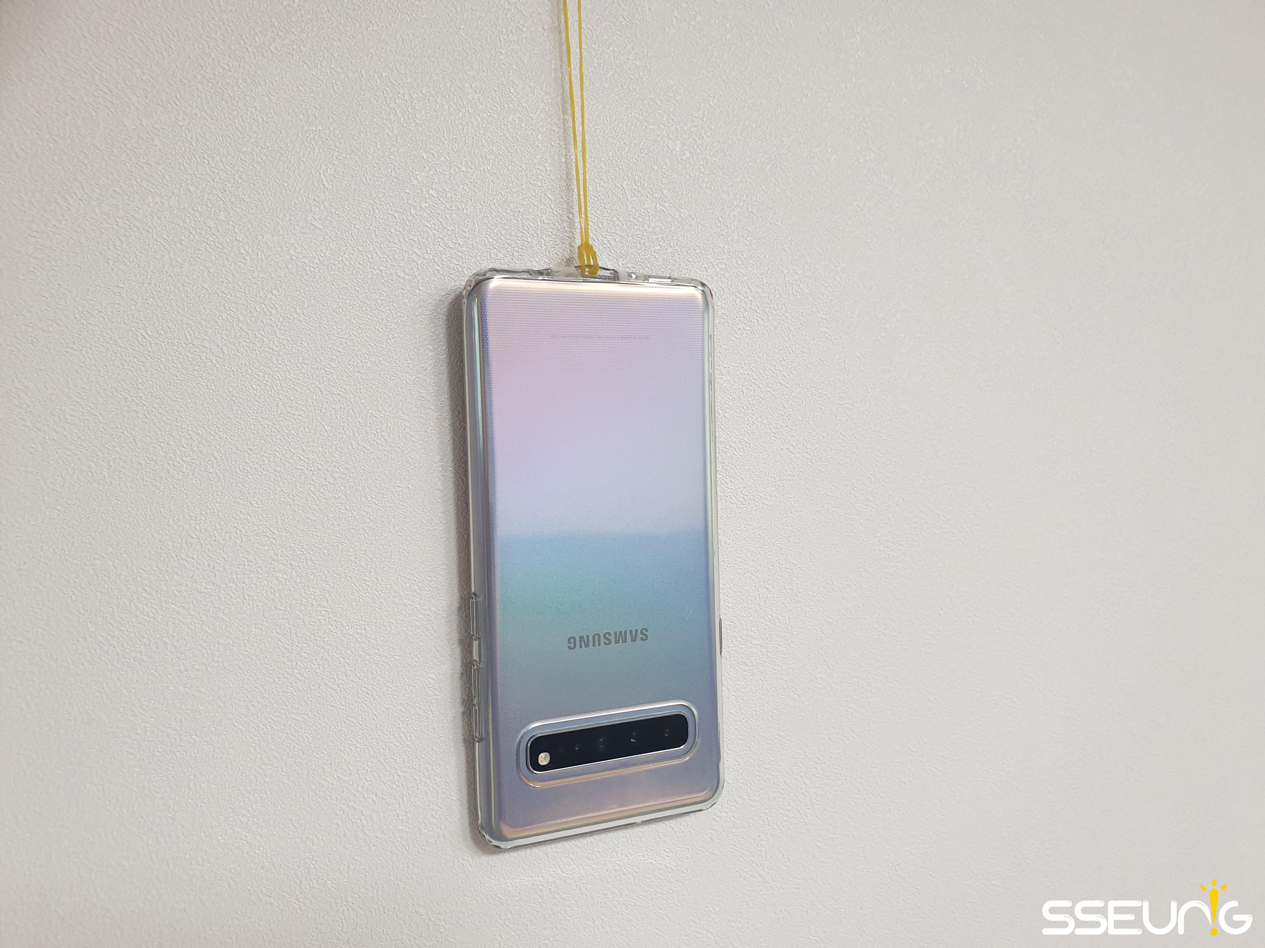 고무줄을 잡고 스마트폰을 늘어트리면 이런 모습이 됩니다.