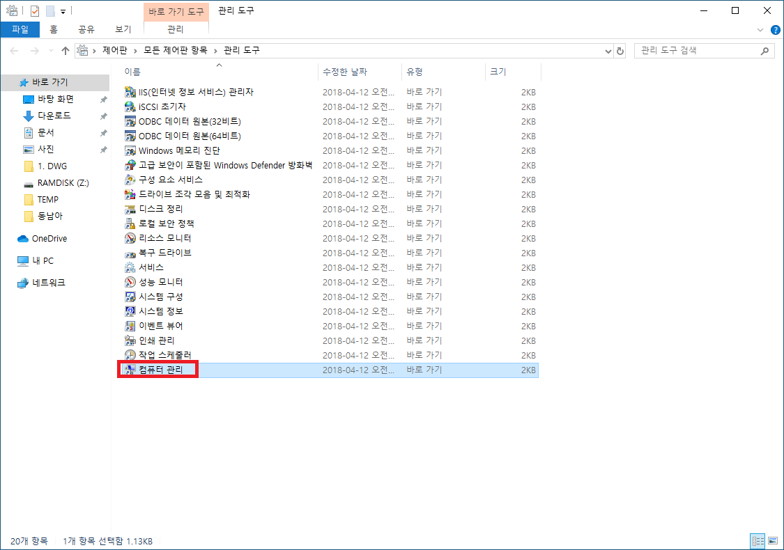 관리 도구에서 컴퓨터 관리로 이동합니다.