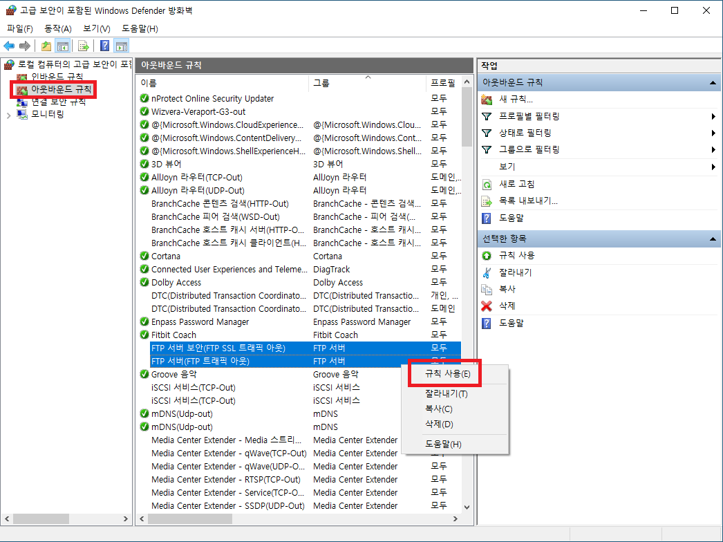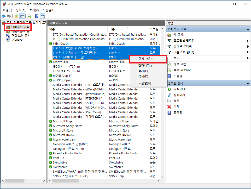 인바운드 규칙에서 위 그림과 같이 FTP와 관련된 3가지 항목을 클릭하여 규칙 사용으로 설정합니다.