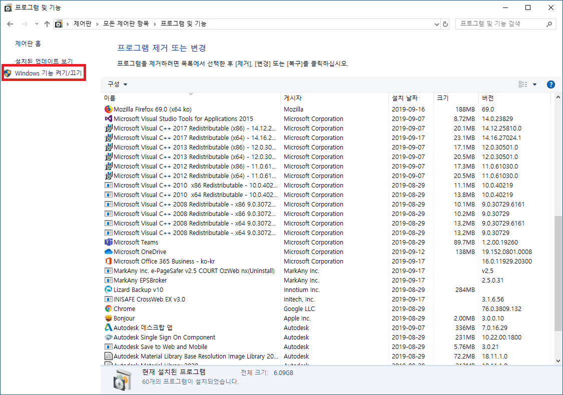좌측에 Windows 기능 켜기/끄기를 클릭합니다.