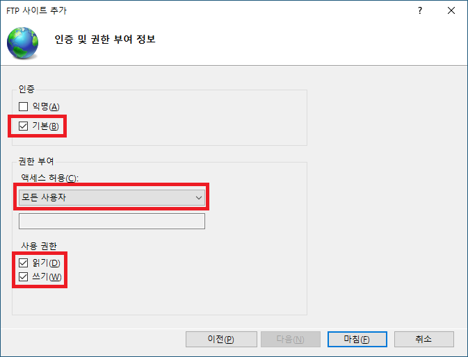 위 그림과 같이 인증에서 기본에 체크하고, 권한 부여에서는 모든 사용자로 변경, 사용 권한에는 읽기 쓰기로 변경한 후 마침 버튼을 클릭합니다.
