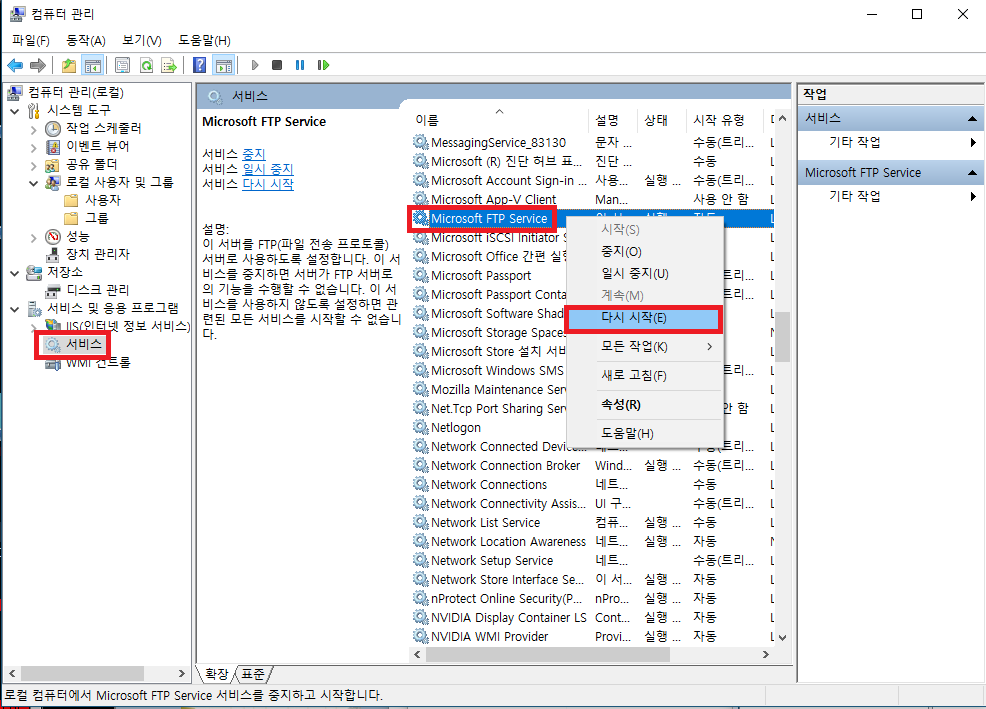 서비스에서 Microsoft FTP Service를 찾아 다시 시작을 시켜줍니다.