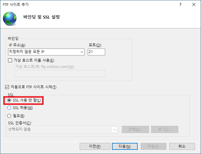 SSL에서 SSL 사용 안 함을 클릭하고 다음 버튼을 누릅니다.
