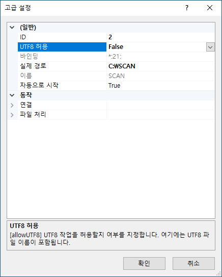 고급 설정 창이 실행되면, UTF8 허용 항목에서 값을 True에서 False로 변경하여 확인 버튼을 클릭합니다.