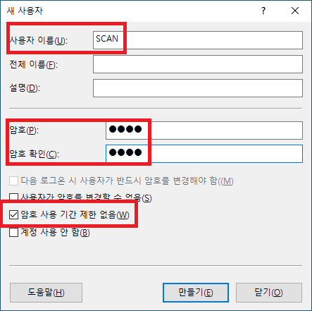 사용자 이름에서는 사용자 이름과 암호를 입력한 후, 암호 사용 기간 제한 없음을 체크하여 만들기 버튼을 클릭합니다.