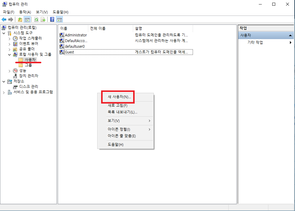 로컬 사용자 및 그룹 -> 사용자에서 새 사용자를 추가합니다.