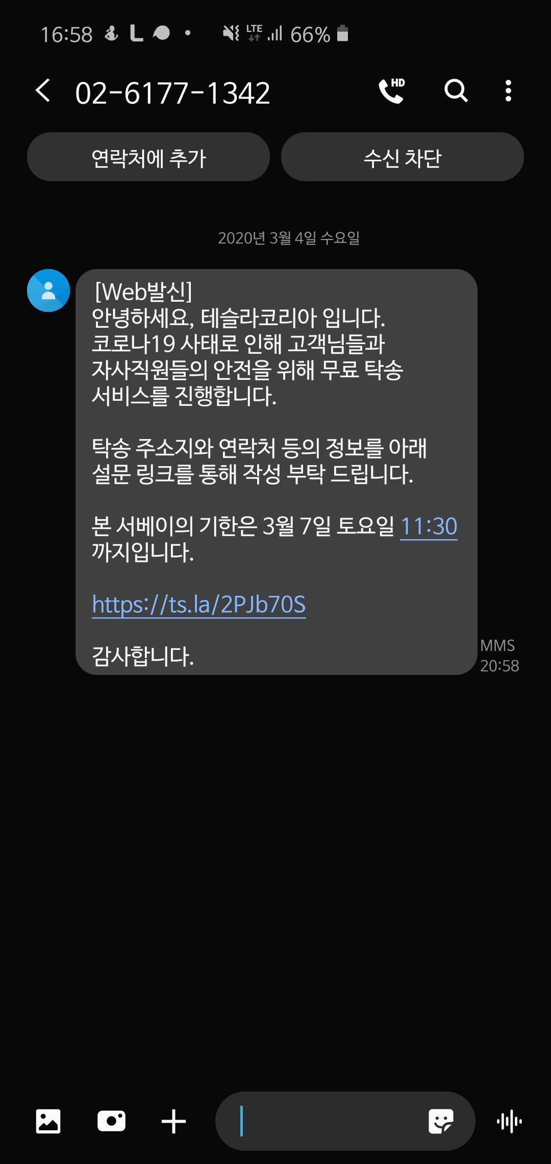 3월 4일 저녁. 테슬라코리아에서 탁송 서비스에 관한 설문조사가 도착하였습니다.