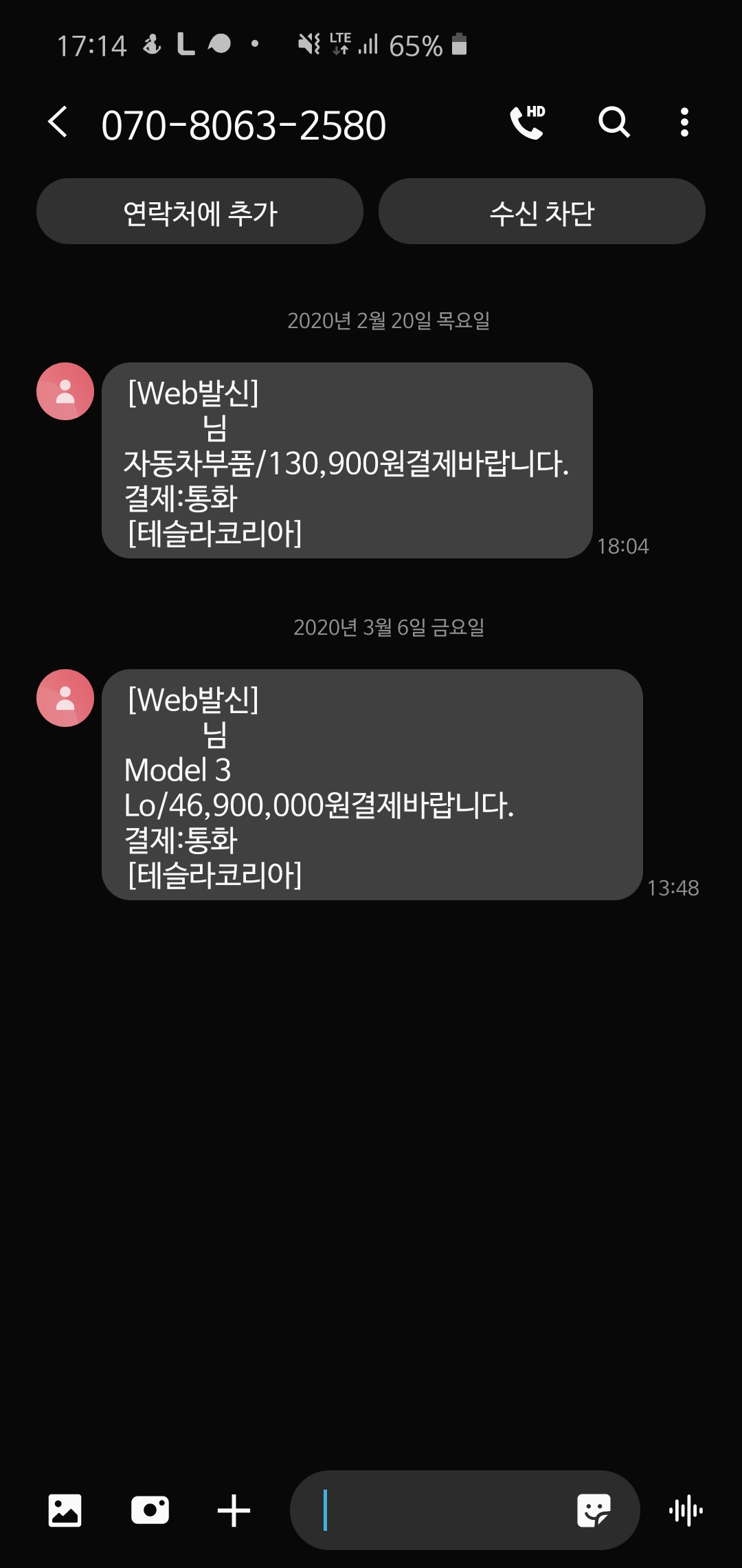 보이스피싱 같은 문자를 받고 통화 버튼을 눌러 결제를 진행합니다.