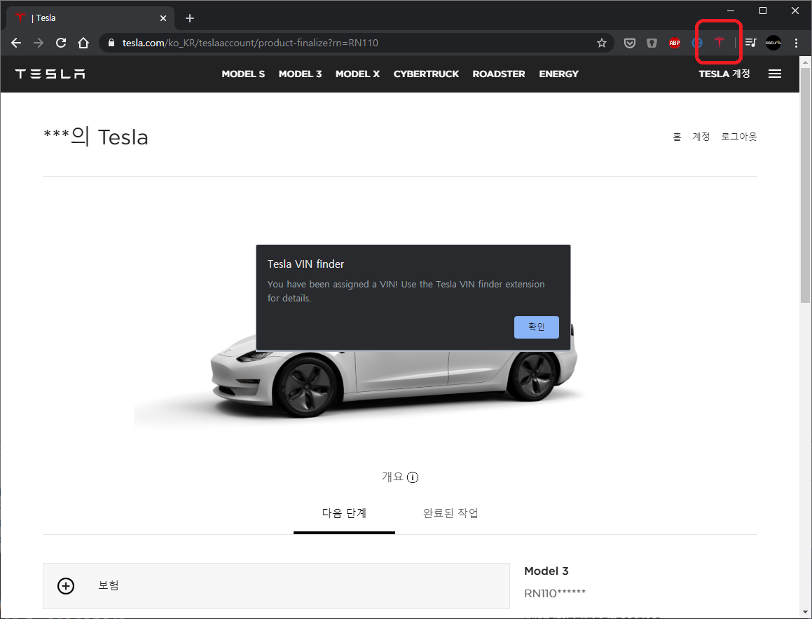 관리로 이동하면 TESLA VIN FINDER 팝업 창이 뜨며 VIN 번호를 찾았다고 뜹니다. 이때 우측 상단에 테슬라 로고가 붉은색으로 변한 것을 확인할 수 있는데요, 팝업창을 끄고 붉은 테슬라 로고를 클릭합니다.