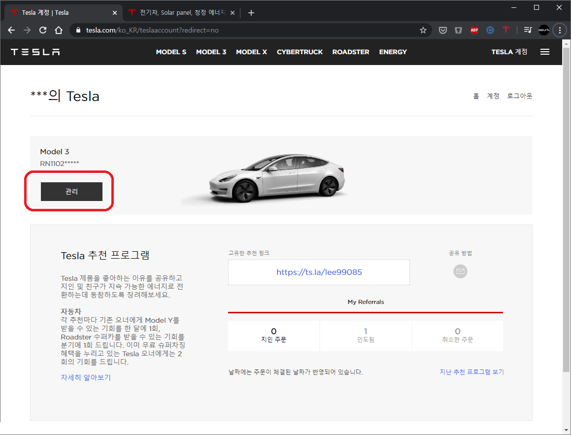 테슬라 홈페이지에 로그인하여 TESLA 계정으로 이동 한 뒤, 위 그림과 같이 관리로 이동합니다.