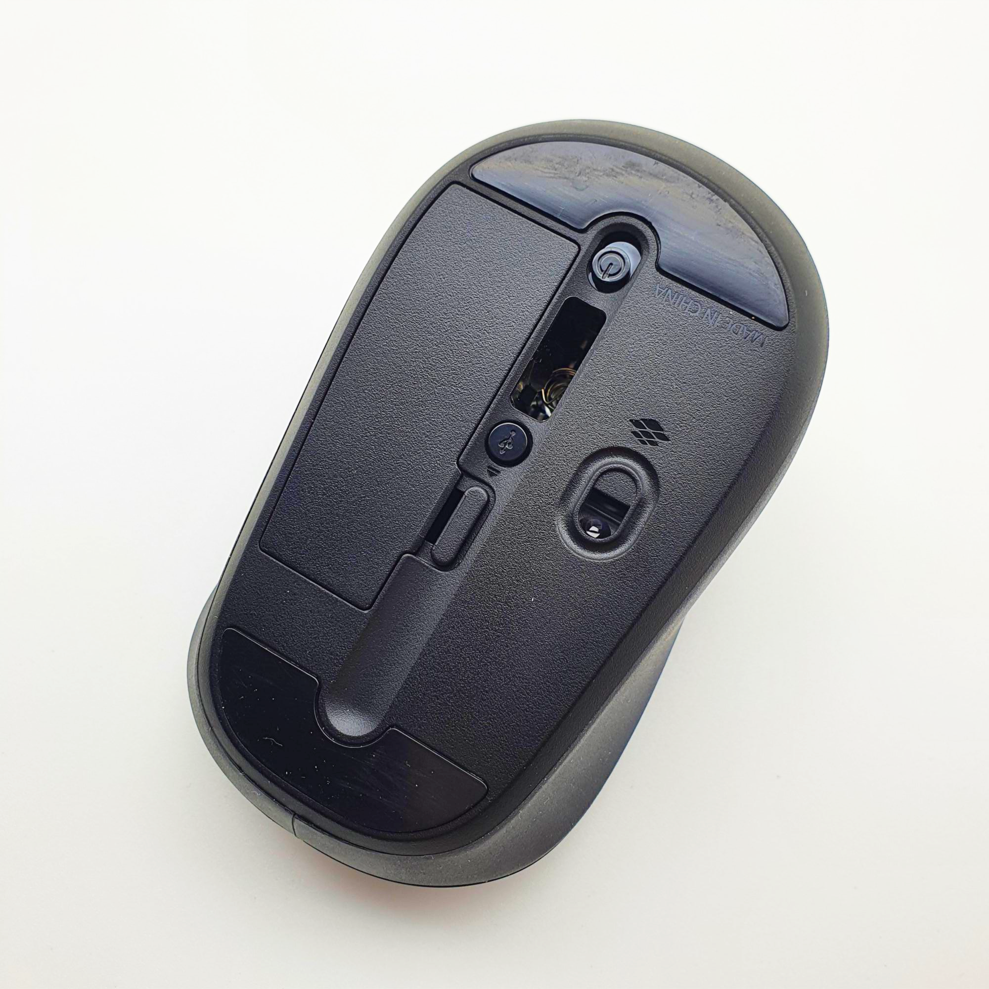 마우스 바닥면에는 상단, 하단에 고무 패드가 부착이 되어 있으며, 배터리를 절약할 수 있도록 전원 버튼이 존재합니다.