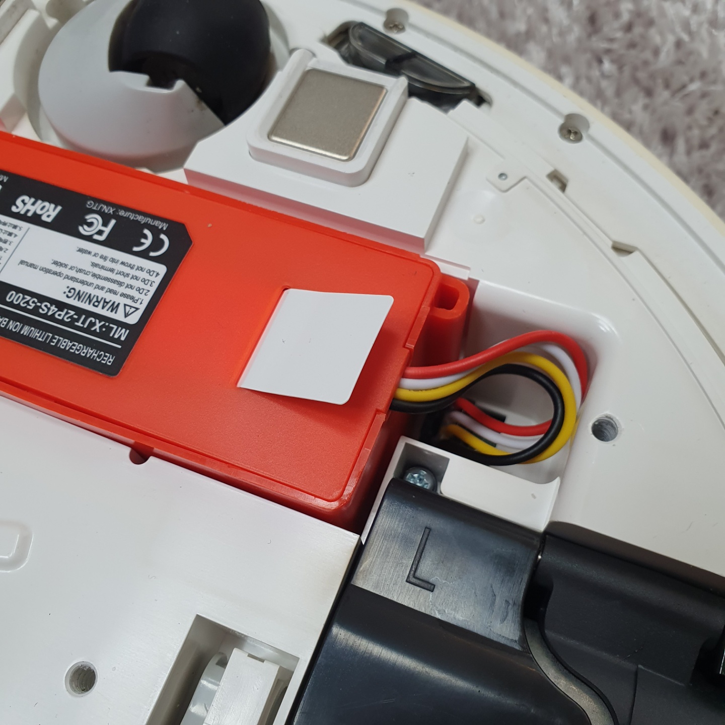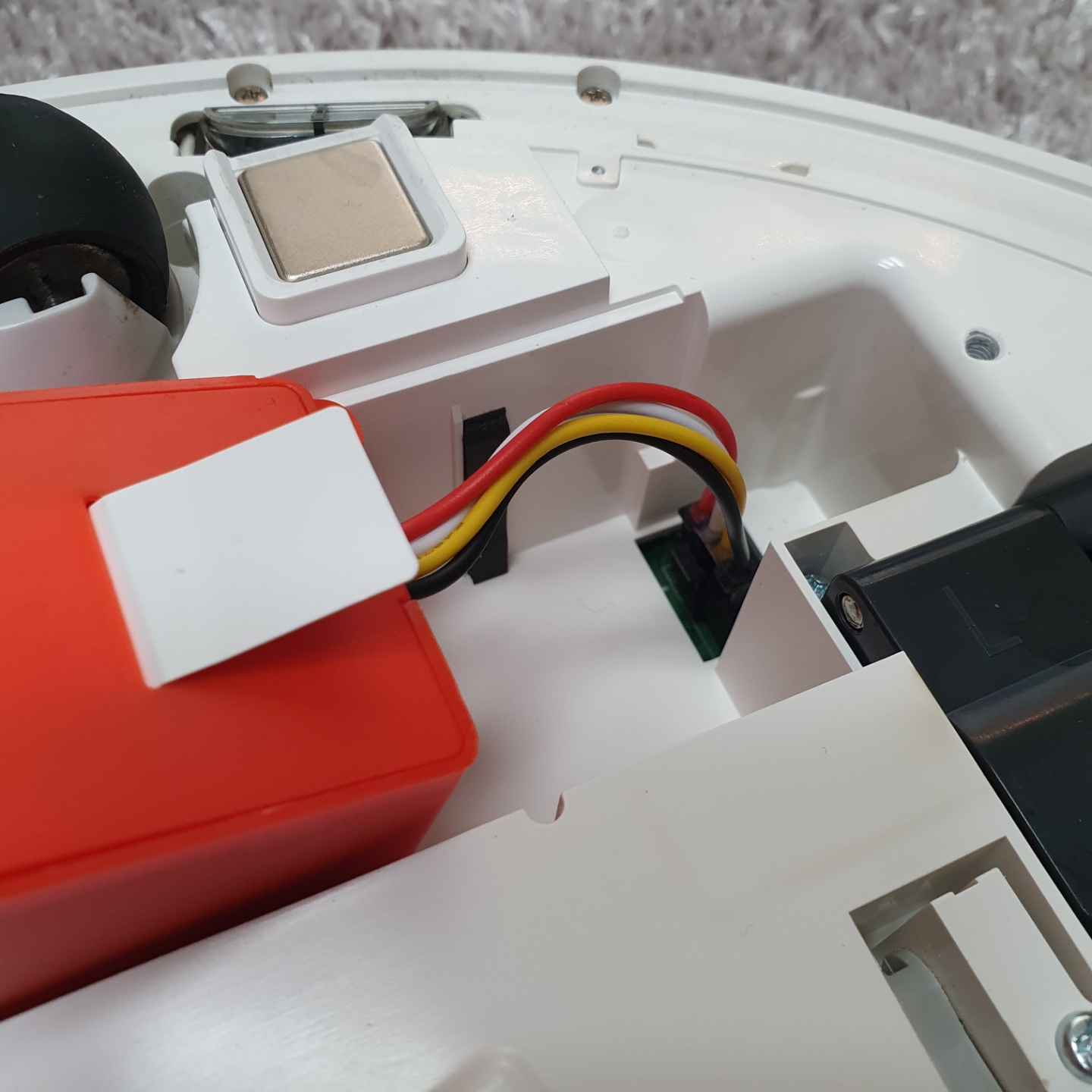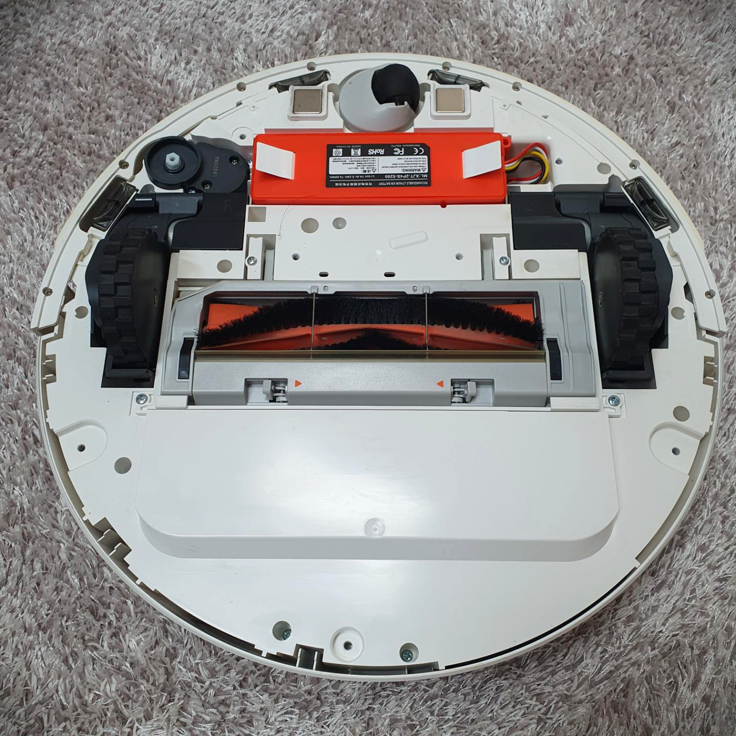 하판을 열면 주황색 부품이 보이실 텐데, 이 것이 로봇청소기의 배터리입니다.