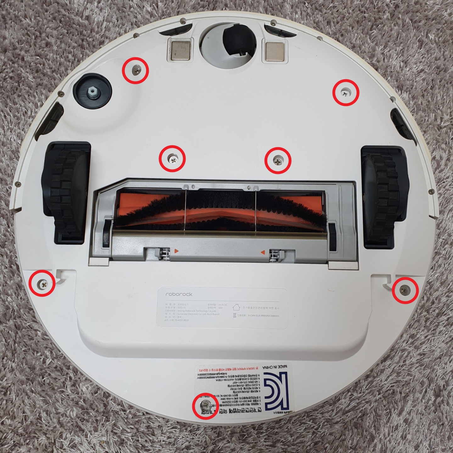사이드 브러시의 나사를 푼 뒤, 사진 상의 동그라미 부분의 나사를 모두 풀어주도록 합니다. 나사의 길이는 동일한 것으로 기억되는데, 잃어버리지 않게 그릇 등에 잘 보관해둡니다.
