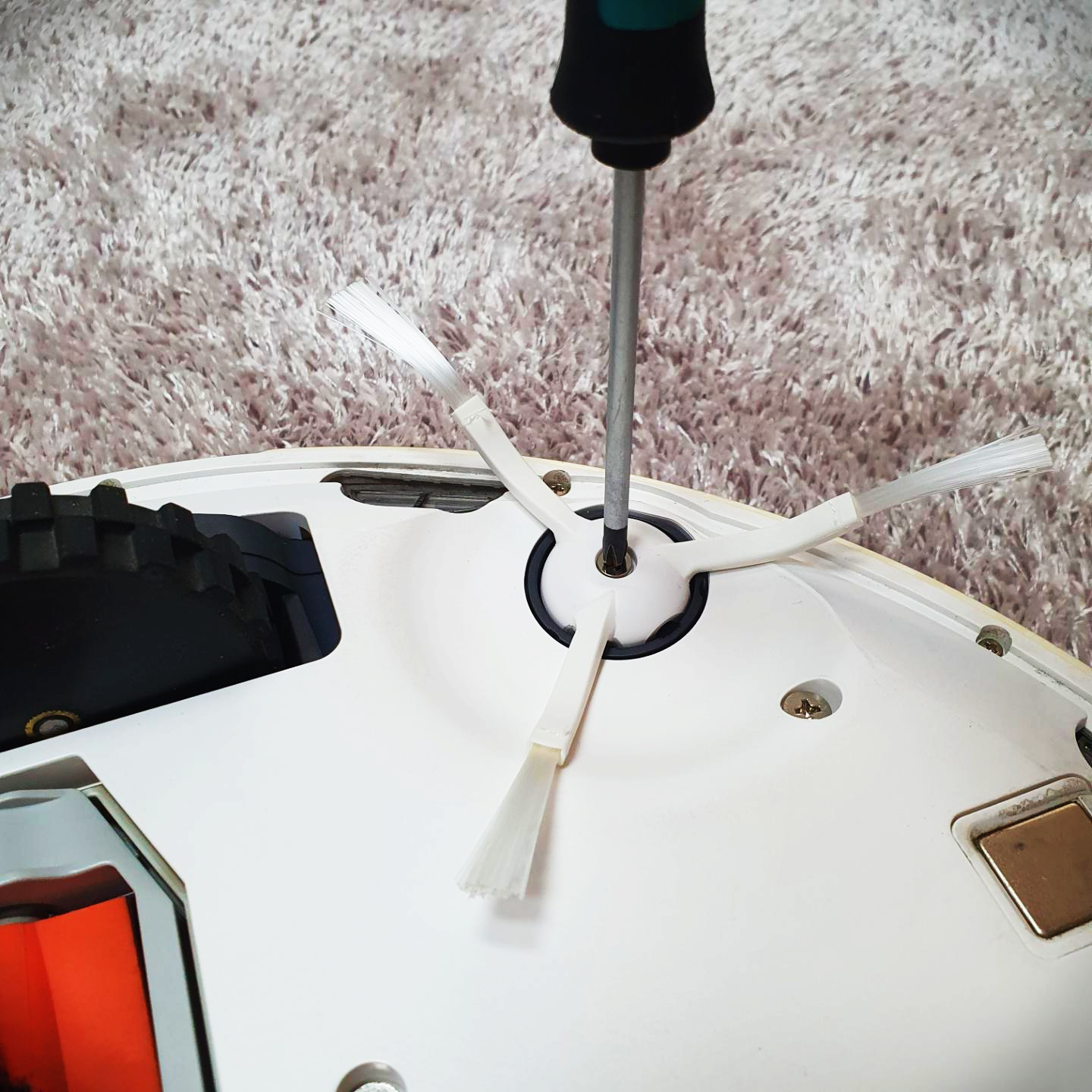 먼저 샤오미 로봇청소기를 뒤집고 사이드 브러시의 나사를 풀어줍니다. 단 나사를 푸실 때 사이드 브러시를 한 손으로 잡고 나사를 푸셔야 합니다.