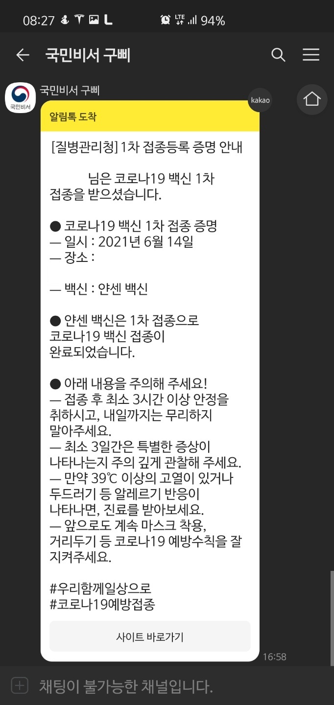 2021년 6월 14일 드디어 얀센 백신을 접종하였습니다.
