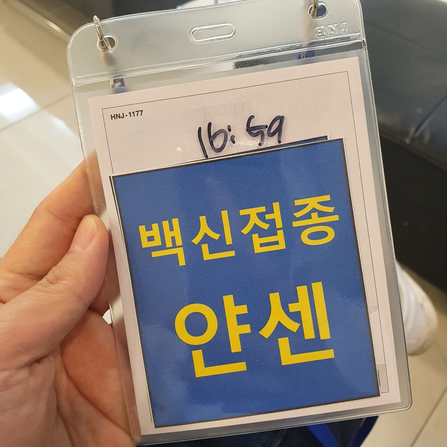 접종 후 15분을 대기하여야 하여 목걸이에 나가는 시간을 적어주셨고, 별도의 대기장소에서 해당 시간까지 대기하였습니다.