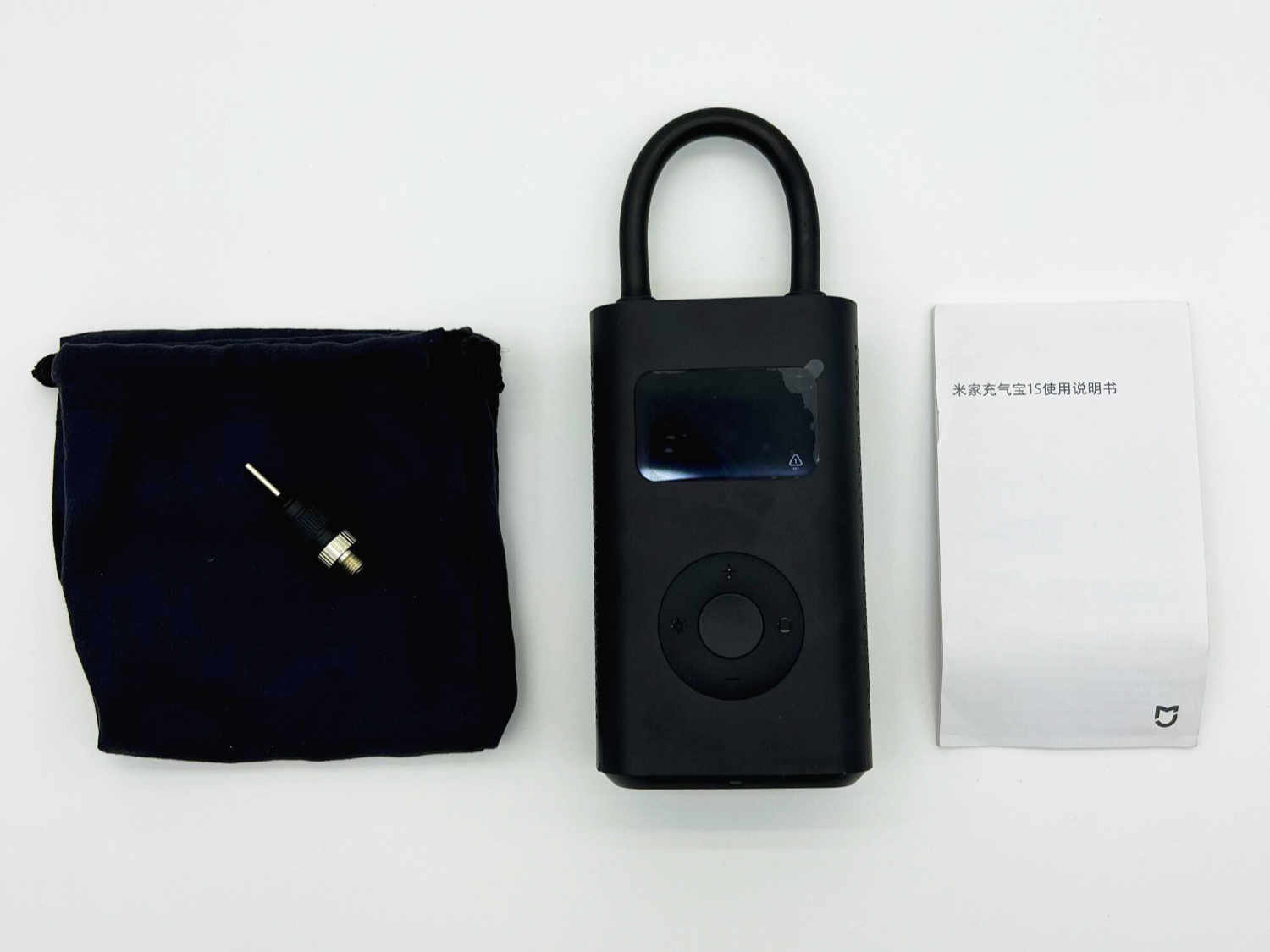 패키지 구성은 기기 본체, 파우치, 프레스타 밸브 어댑터, 사용 설명서가 전부입니다.