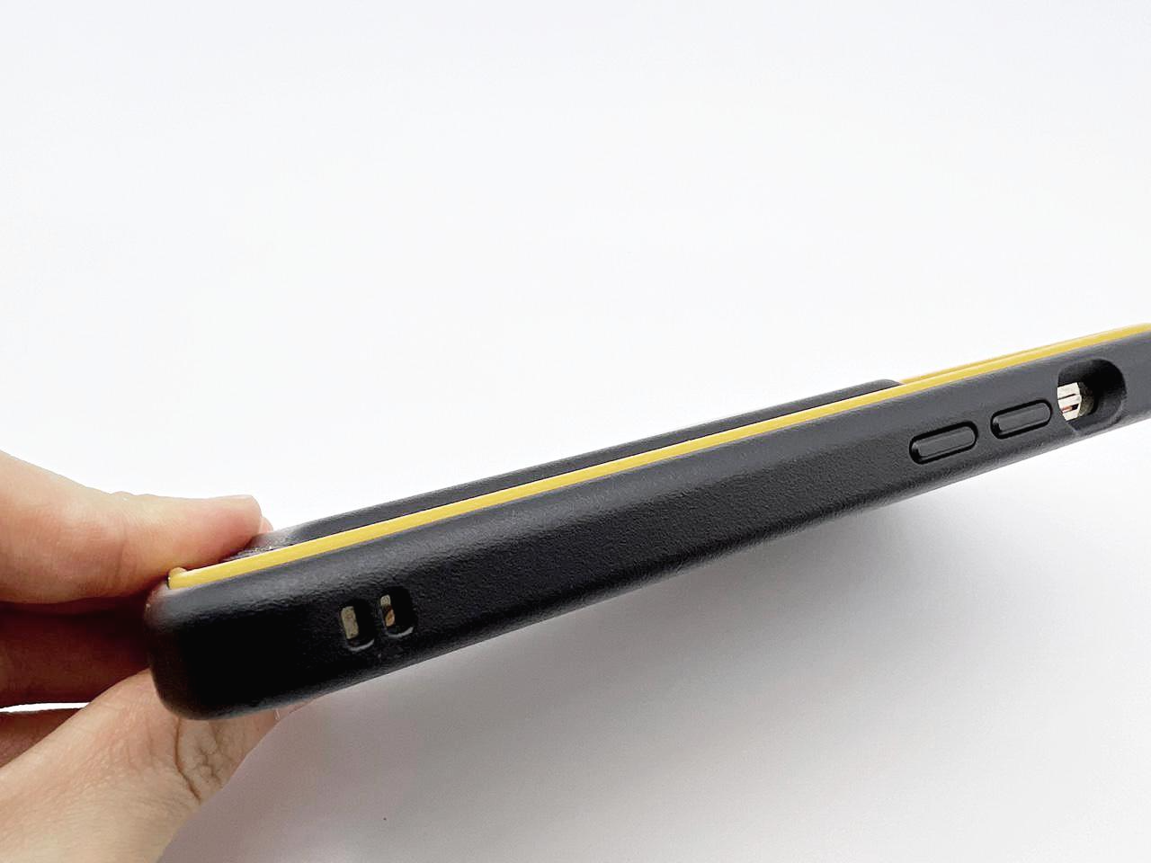 뒷면은 스웨이드 재질로 되어있고 맥세이프 자석이 내장되어 있습니다. 자력은 엄청 세다 정도는 아니지만 일상생활에서 불편함이 없을 정도로 강합니다.